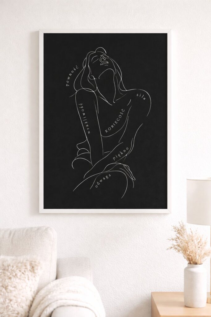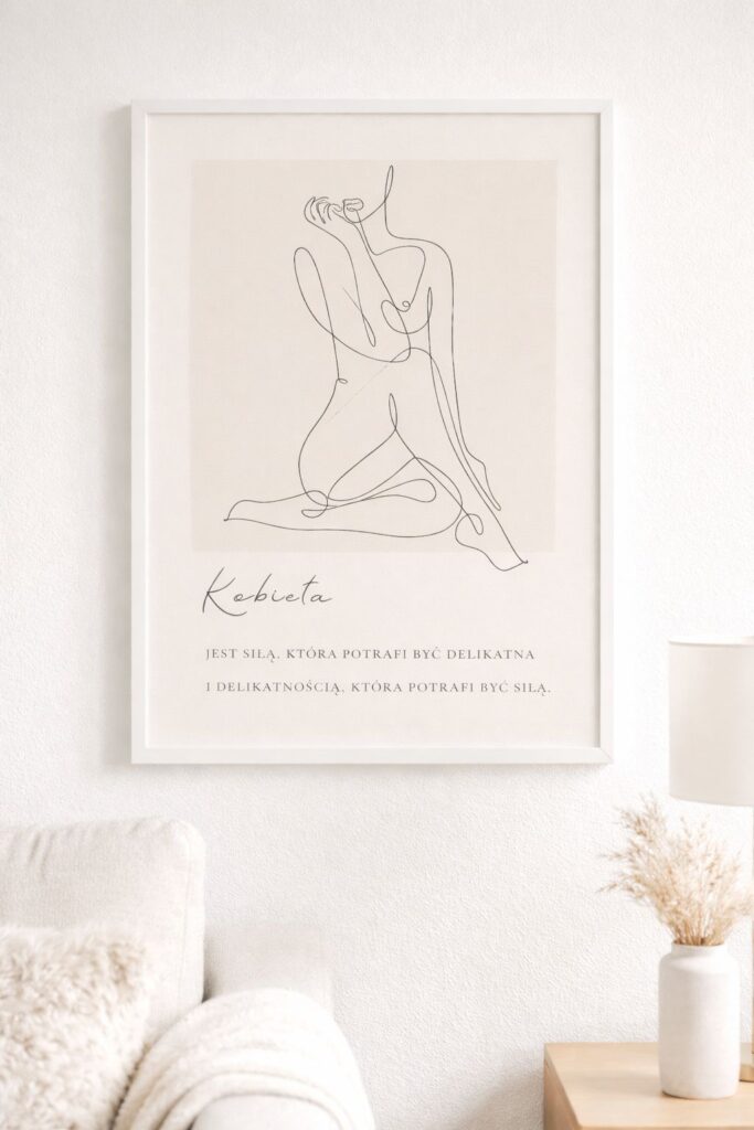 Minimalistyczny plakat z kobiecą sylwetką i inspirującym cytatem o sile oraz delikatności. Subtelna dekoracja, która przypomina, że prawdziwa siła kobiety tkwi w jej wrażliwości i pięknie.